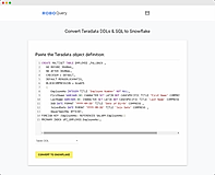 Roboquery is a cloud management tool that aids developers by converting their database objects and SQL queries while migrating from one platform to another. The supported platforms include all major players such as Teradata, Snowflake, and Google BigQuery. All schemas can be converted within a few seconds, accelerating the cloud migration. And with automated workflows, human errors can be avoided while moving to the cloud. The tool can convert Table DDLs, View DDLs, SQL Scripts including macros and procedures, and more. It only converts the database objects without porting the actual data in the tables. Users can migrate simply by copy-pasting the SQL query or DDL from the source, choosing the target platform and clicking on convert. This does not involve any complex setups or developer training. Roboquery also focuses on privacy by not storing any of the queries of scripts. It even transmits all data through a secure protocol (HTTPS).